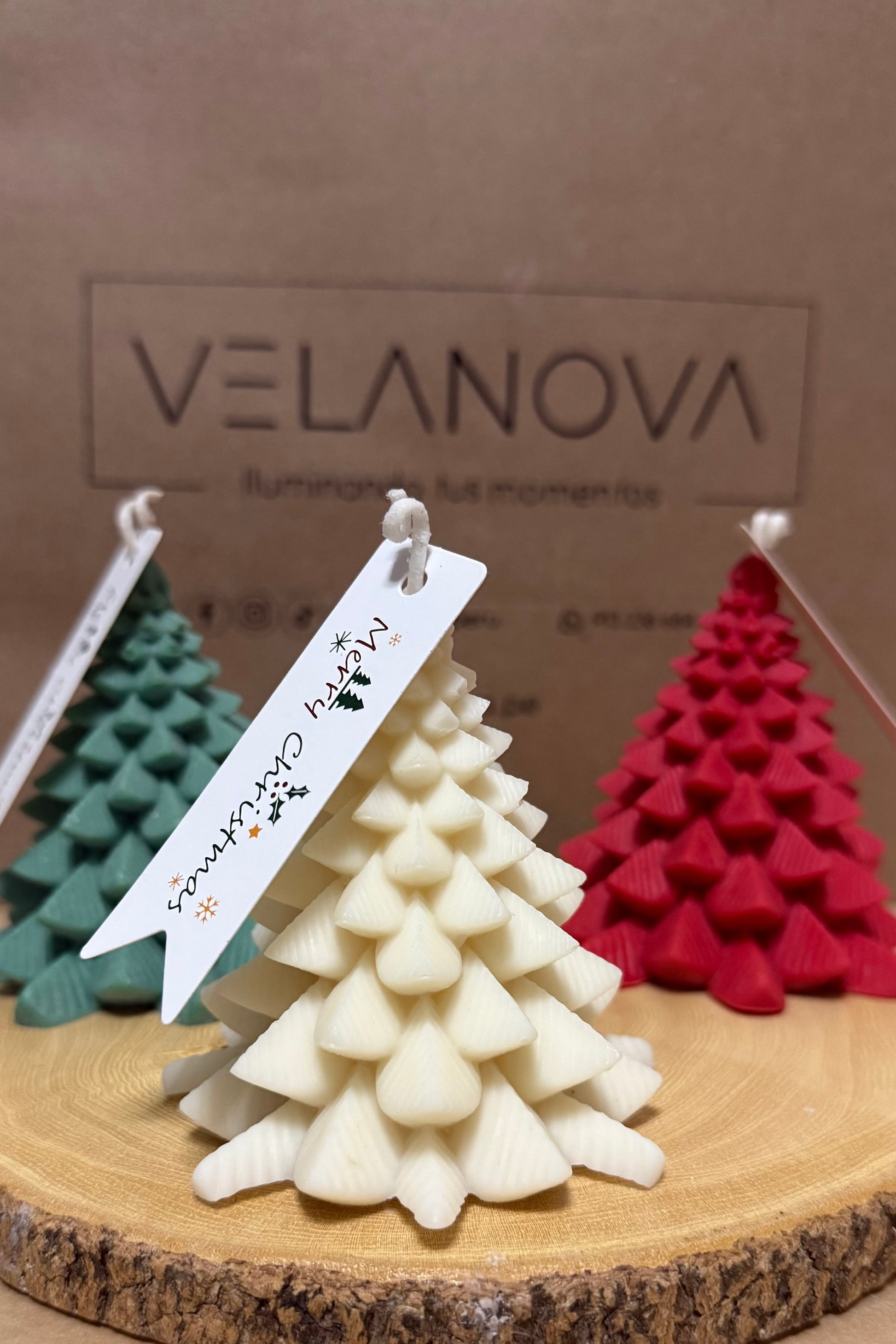 Vela decorativa con diseño de árbol de Navidad, hecha de cera de Soya y acabados detallados la convierten en un accesorio perfecto para decorar tus espacios durante la temporada navideña.
