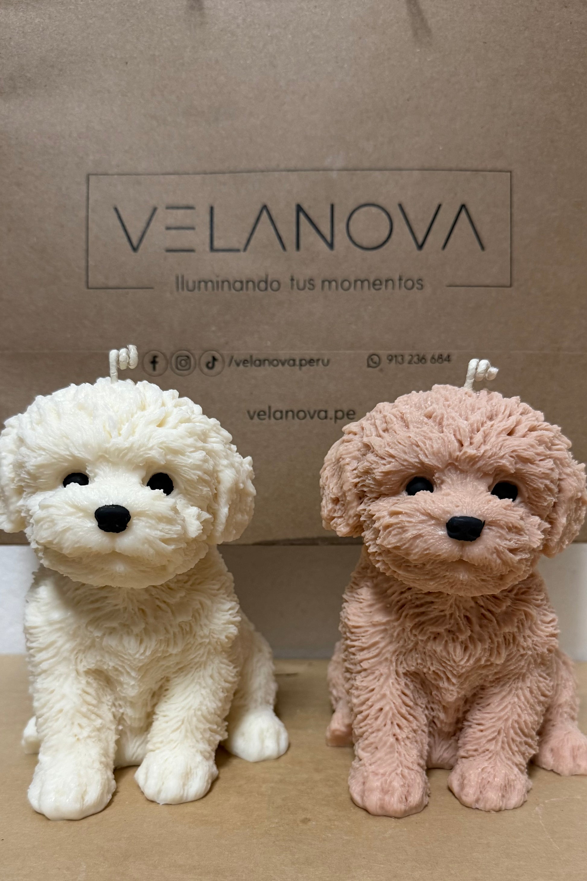 Vela decorativa en forma de perrito, elaborada a mano con cera de soya 100% natural.